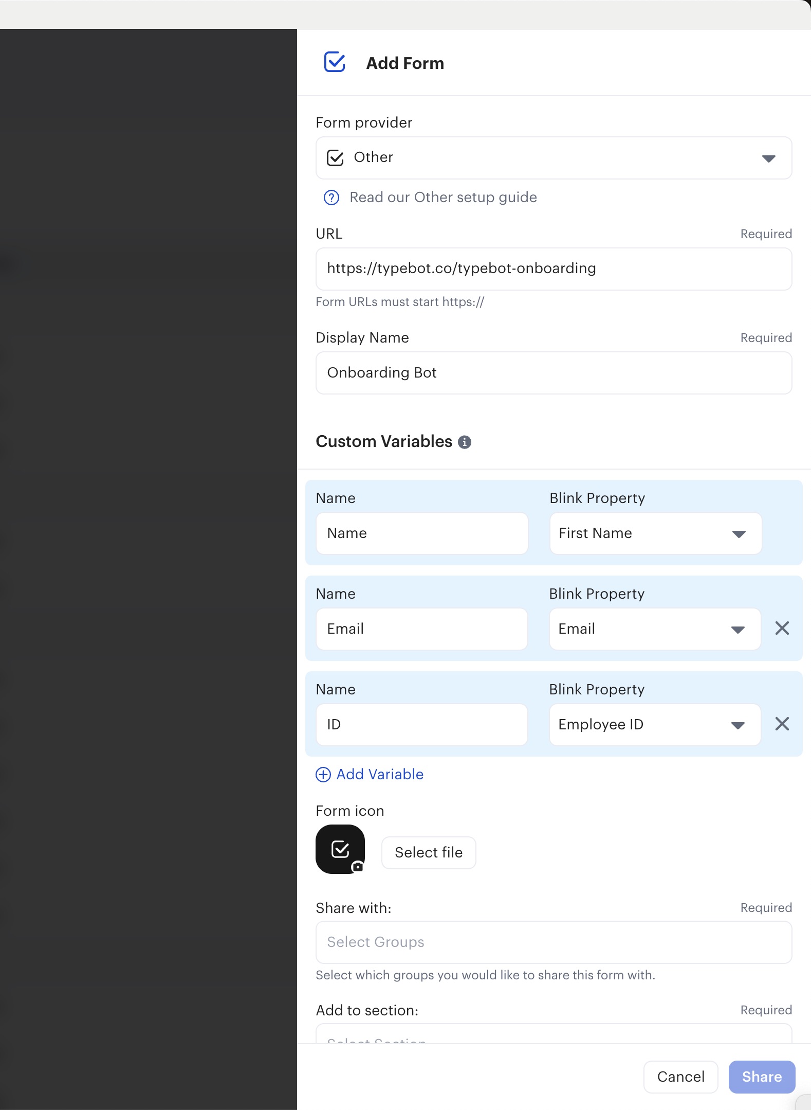- You can optionally add Custom Variables meaning that you can prefill the variables in your bot with the respondant’s Blink data. For example you can prefill the