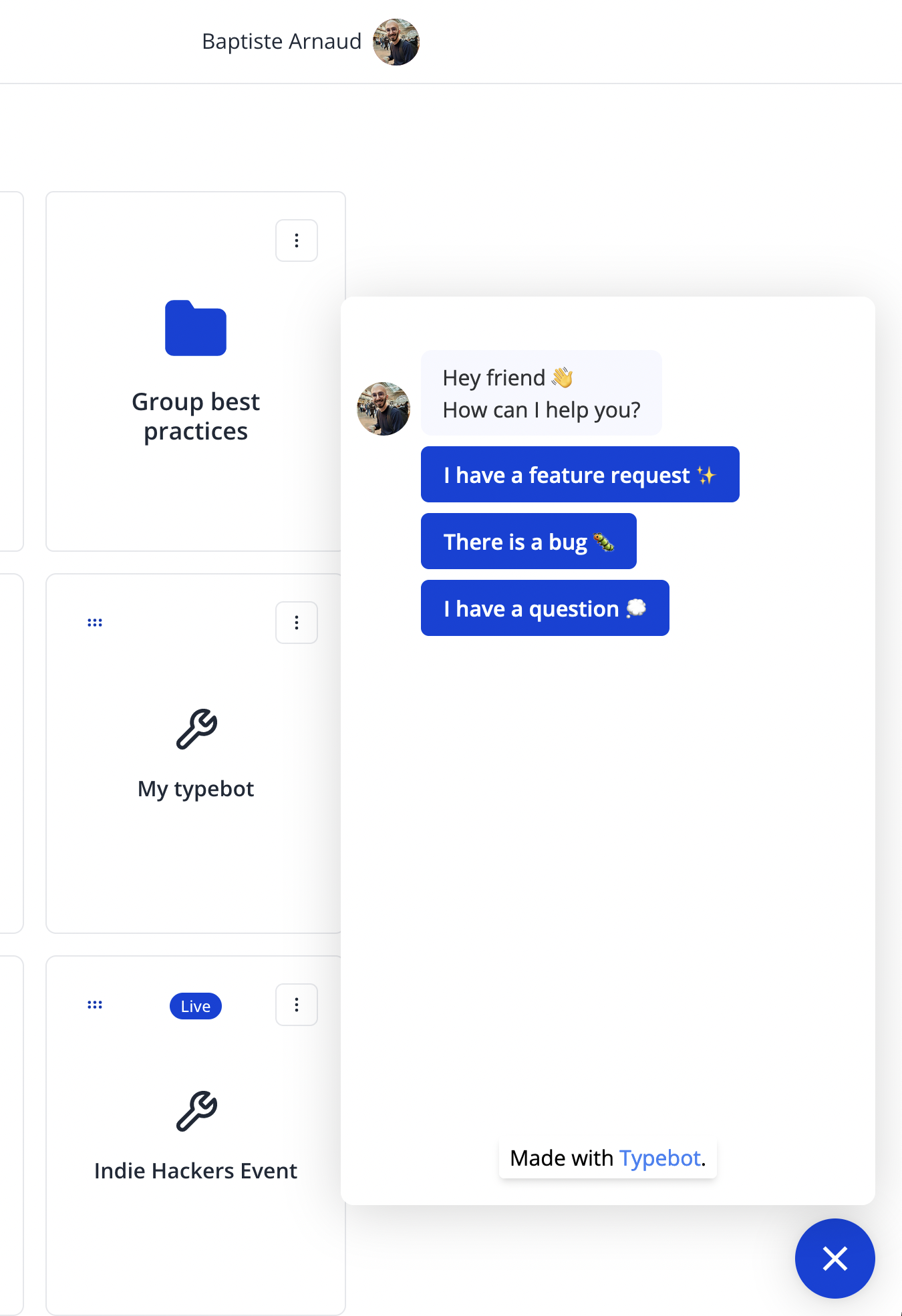 Embeds the typebot as a “chat bubble” at the bottom right corner of your site. Can be triggered automatically or with a click. It can also come with a “proactive message”.