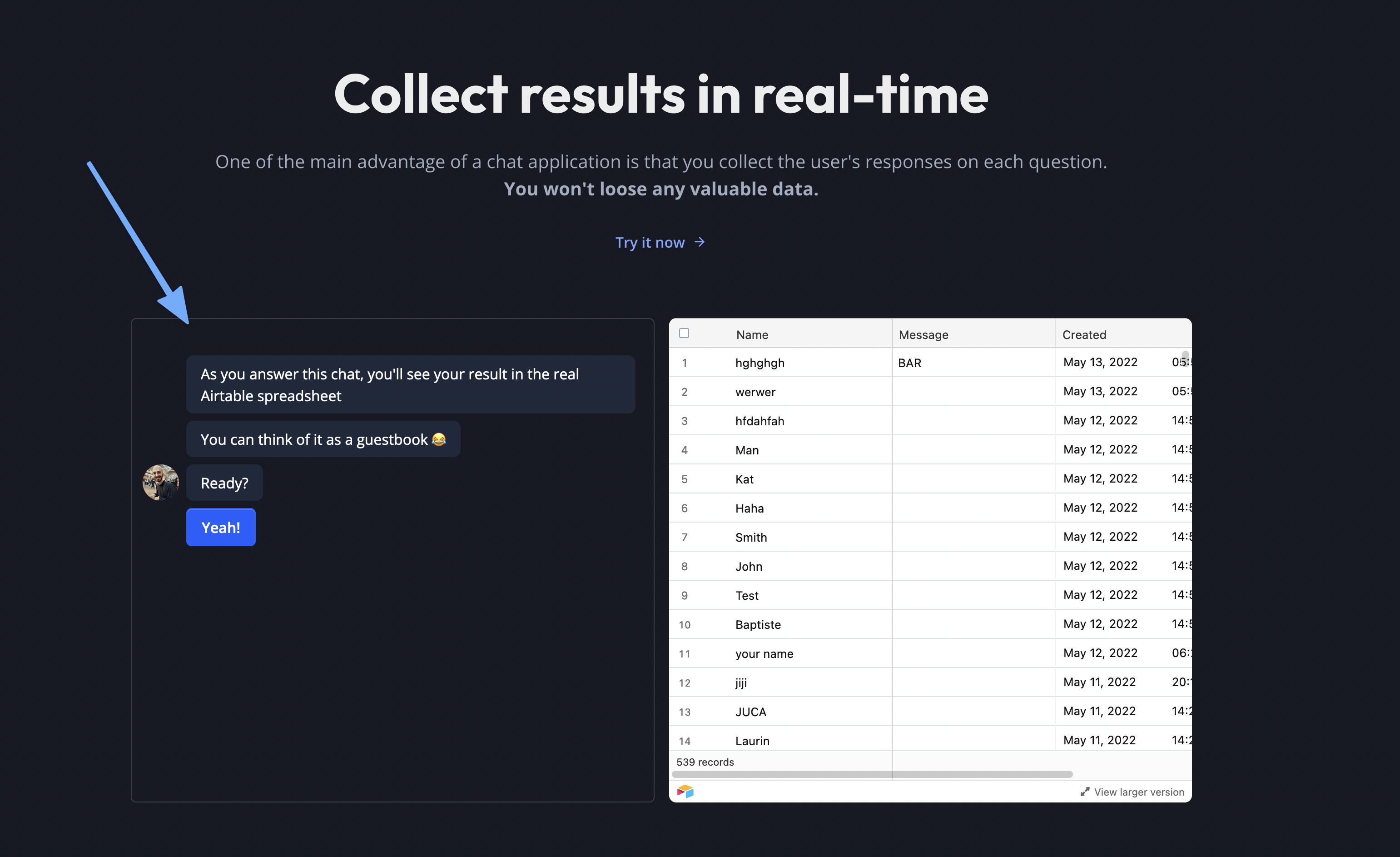 Embeds the typebot in a box with the size of your choice anywhere on your app. This is what is used on Typebot homepage: