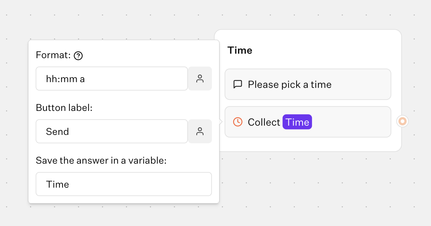 The Time input block allows you to ask your user for a time. You can chose between 12 hour and 24 hour format.