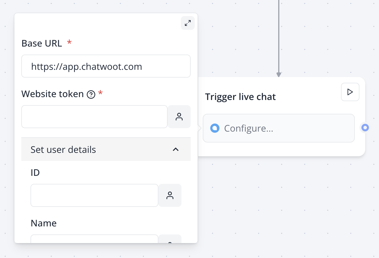 The Chatwoot integration block allows you to open a Chatwoot widget to allow your user to directly talk to a human. It allows you to add a Live Chat layer on your typebot.