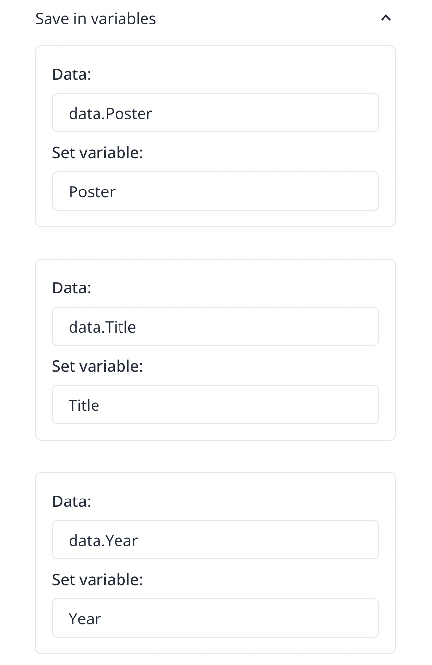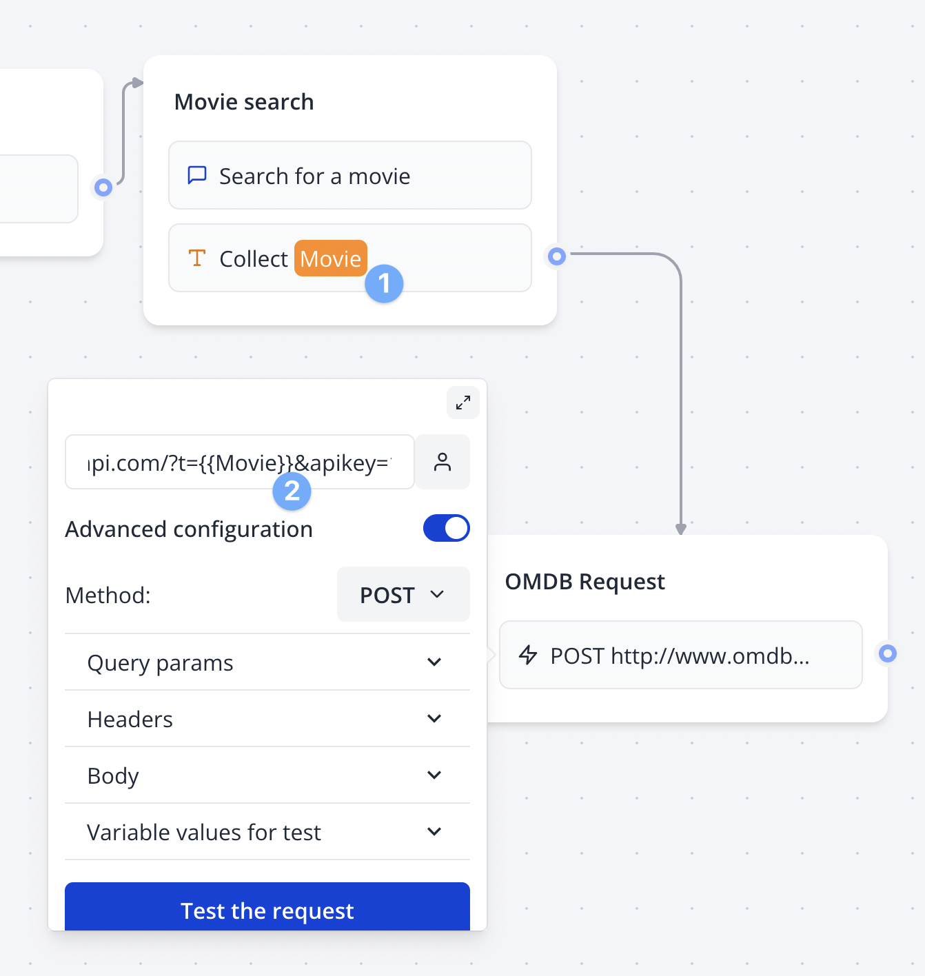 Let’s create a bot that ask for a movie and retrieve its informations (By sending an HTTP request to the OMDB API). From the documentation, I know that by calling this specific URL: http://www.omdbapi.com/?t=Star%20Wars&apikey=1eb4670b, it will search for “Star Wars” movie information and return JSON data. What I need in my case is instead of inserting “Star Wars”, I’d like to insert a Typebot variable: