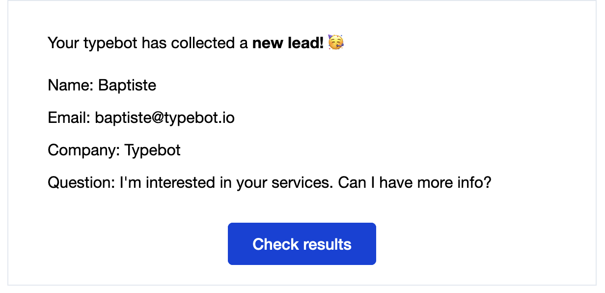 If you want to receive an email notification each time a user completes the bot or if you want to send a recap to the user, the Email block is made for you: