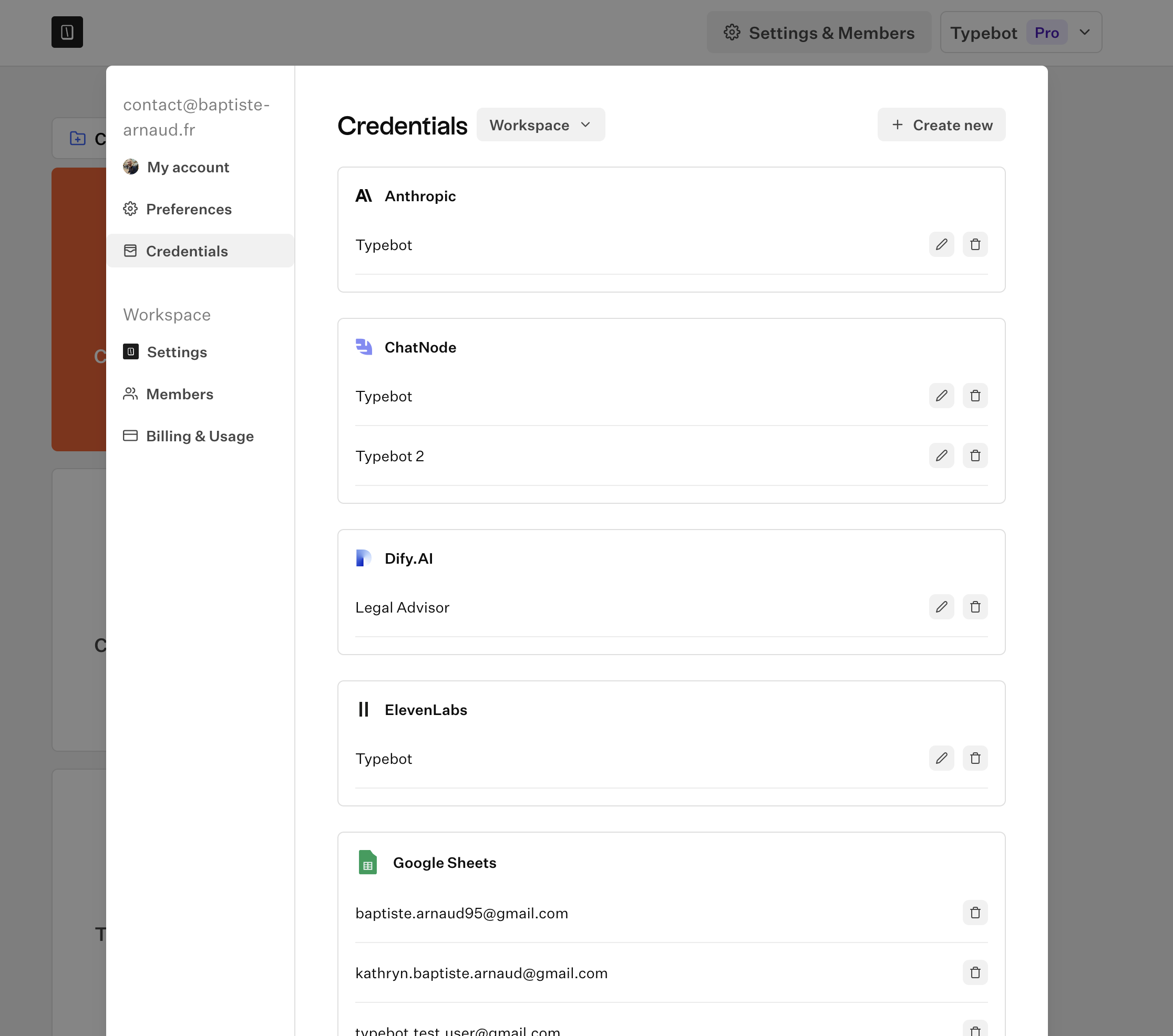 Credentials are used to connect Typebot to other services securely. These credentials can have 2 different scopes: User or Workspace.